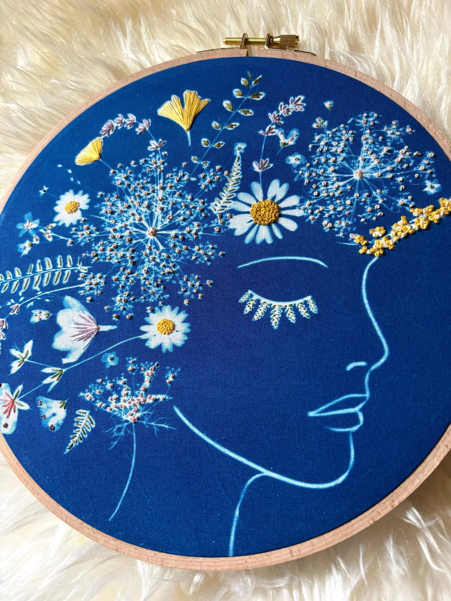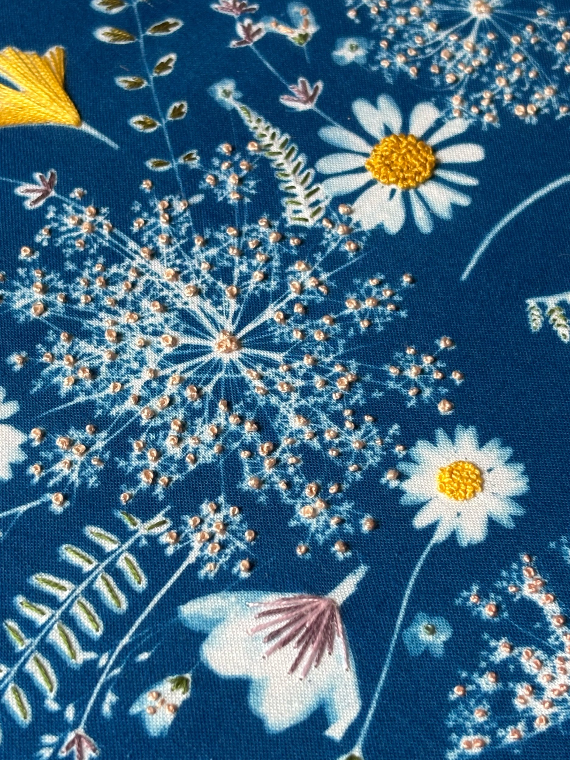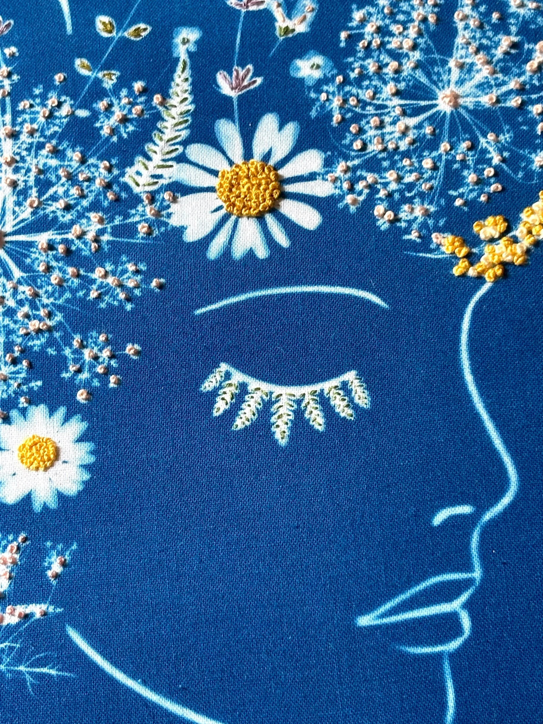 Original cyanotype on cotton with hand embroidery.